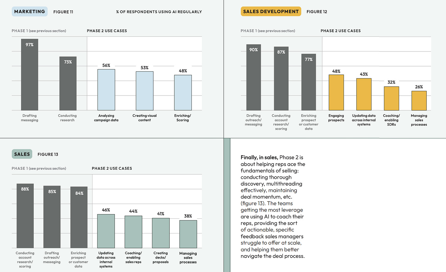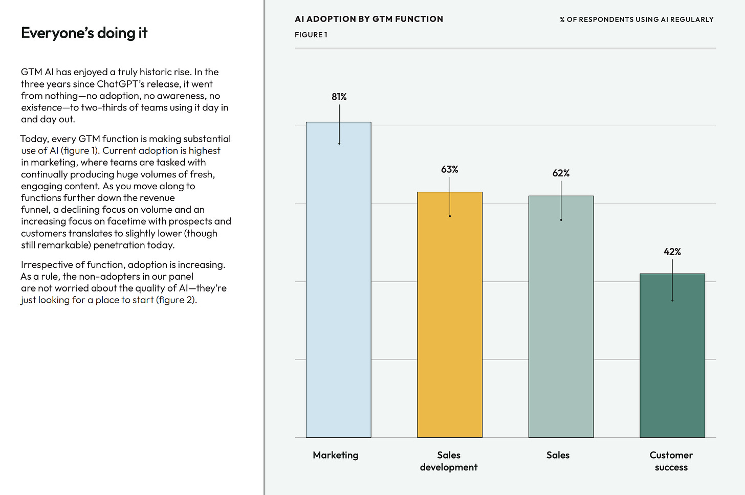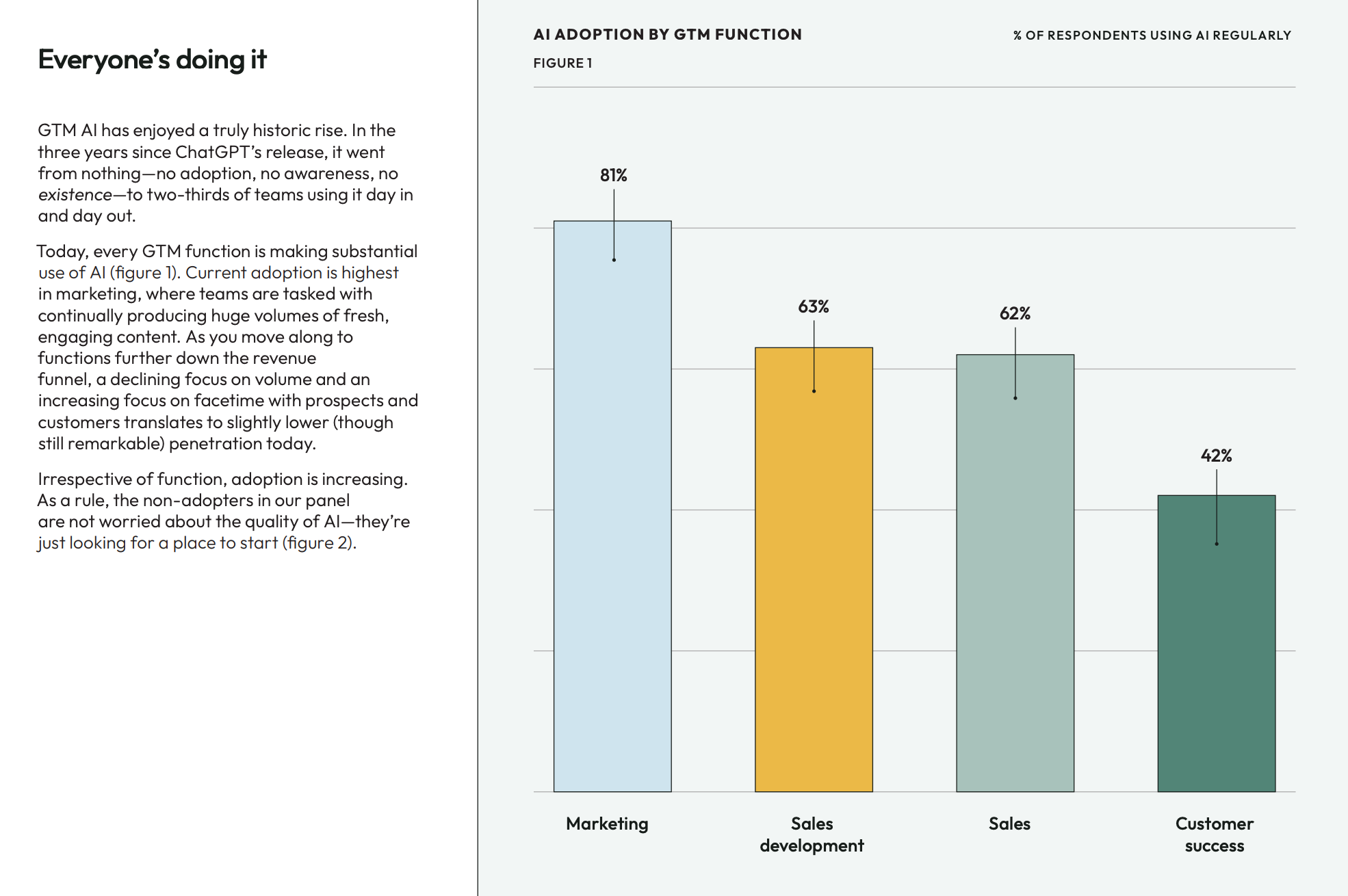 Mainly because they confirmed some of the beliefs and findings we’ve had here at CS2. But also because, according to the results, 80% of GTM teams are using AI! A higher number than I expected.